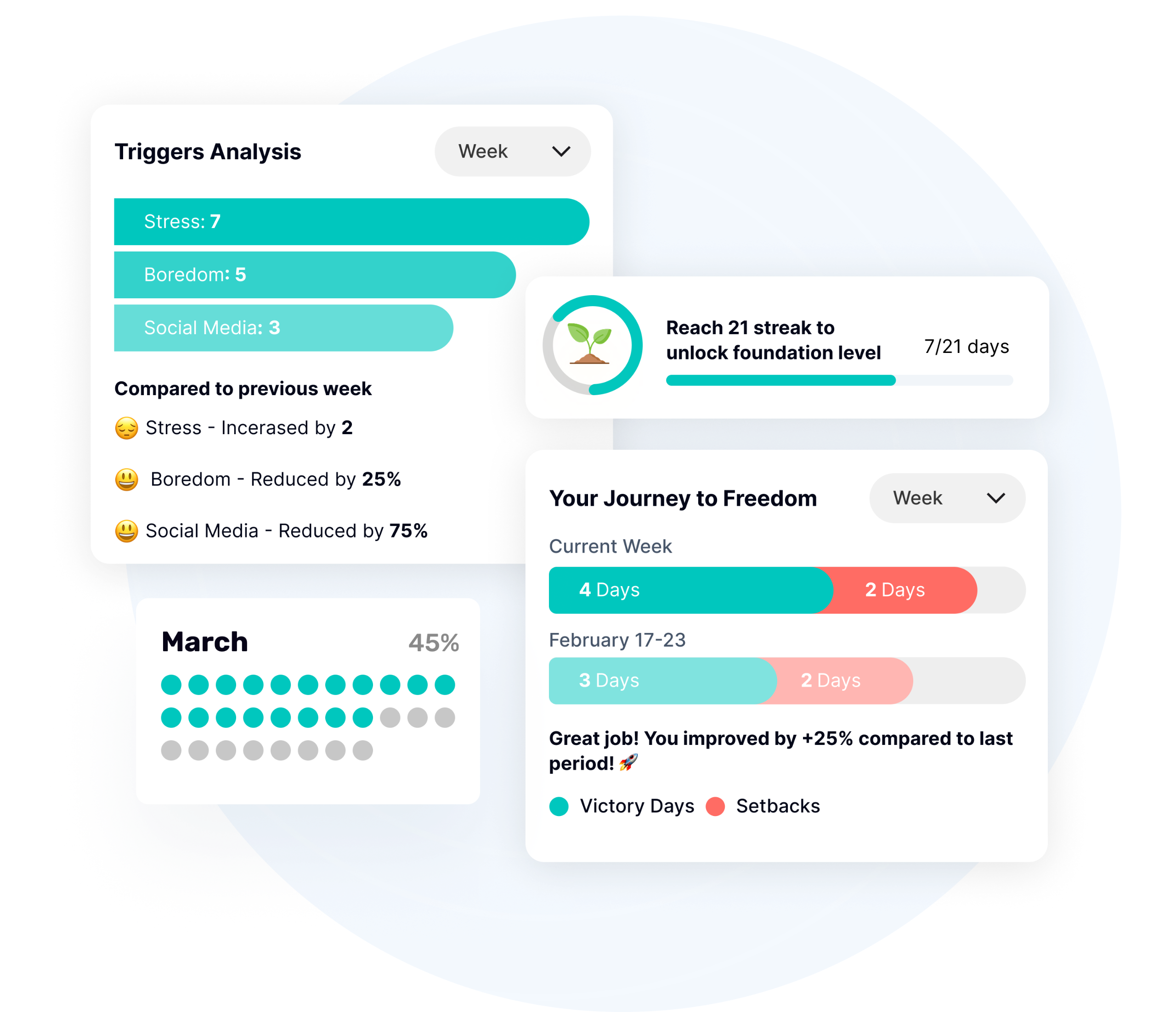 While many apps make you feel like a failure after a relapse, ClearMind focuses on trends rather than raw streak counts. This way, you can always see your genuine progress.